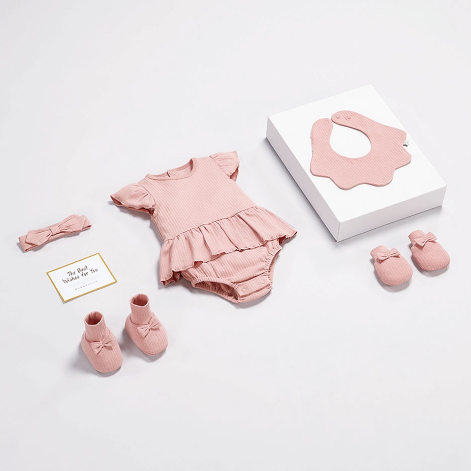 內容物:短袖紗裙包屁衣x1入、嬰兒帽x1入、圍兜x1入、護手套x2隻、護腳套x2隻