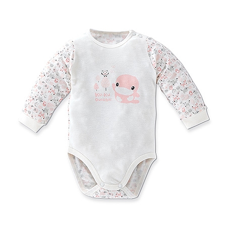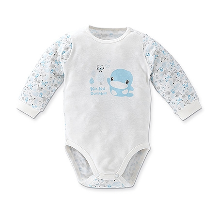 領口單側有肩部按扣開合,穿脫更便利。連身設計,檔內按扣可便於穿脫及更換尿布。