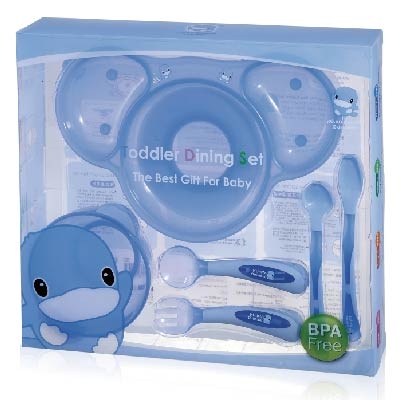 酷咕鴨學習餐盤組,內含三格餐盤(附吸盤)、止滑雙耳碗、果汁+果泥湯匙組、學習湯叉組,使用無雙酚A安全材質,依照寶寶每個成長階段設計,學習獨立餵食的能力。