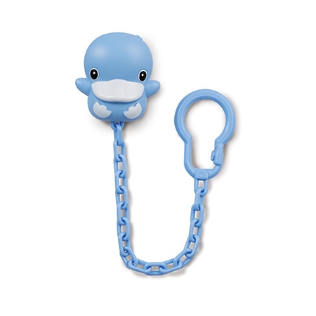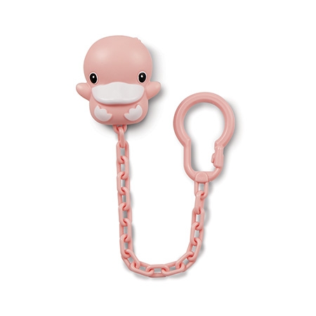 新一代酷咕鴨造型奶嘴鍊,背夾按壓設計可輕鬆夾住衣服,另一端可吊掛奶嘴或各式小物,讓寶寶在活動時不易遺失或掉落。經拉力測試合格,可承受10公斤拉力。