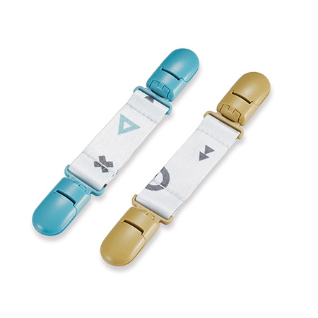 特色:雙邊彈跳式背夾可一邊夾住衣物,另一邊夾手帕、口水巾、哺乳巾等各式小物,讓寶寶在活動時不易遺失或掉落。