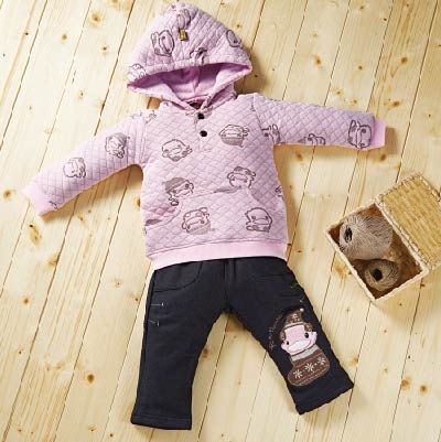 舒適連帽上衣,緹花舖棉菱格布搭配酷咕鴨圖案,呈現星光耀眼款上衣。帥氣風格長褲,舒適絨毛彈性牛仔布剪裁製作,簡單穿出帥氣休閒風格。
