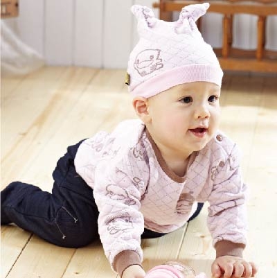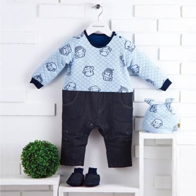 可愛酷咕鴨棉柔緹花舖棉菱格布搭配酷咕鴨圖案,搭配率性Style的彈性牛仔格褲,舒適的連身裝讓寶寶大量活動也不會露出小肚肚喔!
